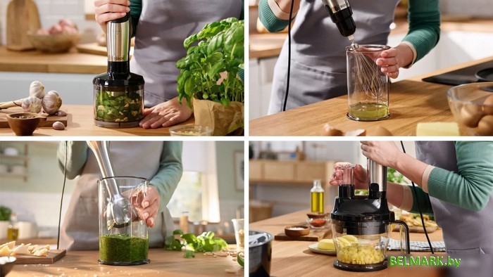 | Комплектация | Блендер из нержавеющей стали с ножем QuattroBlade Измельчитель для специй, орехов, сыра, мяса и многого другого (полезный объем 500 мл) Венчик из нержавеющей стали для взбивания сливок или яичного белка Мерный стакан в комплекте Кухонный комбайн с насадкой для измельчения, нарезки, шинковки, замешивания и нарезки кубиками (полезный объем 1,25 л, размер кубика: 9 x 9 мм) |