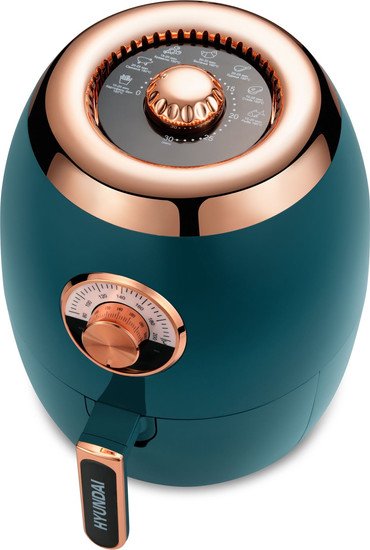 | Информация | ? Компактный аэрогриль в минималистичном исполнении и оригинальном дизайне. ? Мощность прибора составляет 1350 Вт, что позволяет ему нагреваться до температуры в пределах от 80 до 200 градусов. ? Время приготовления и режим термической обработки на нем настраиваются посредством двух круглых регуляторов. ? Первый, расположенный на передней стенке устройства, отвечает за включение и температуру, а второй, находящийся сверху, позволяет активировать таймер (до 30 минут). ? Когда заданный промежуток заканчивается, гриль издает громкий звук. ? На верхнюю часть также нанесена памятка о рекомендуемой температуре и оптимальном времени приготовления для разных продуктов. ?? Корзина прибора, в которой происходит термическая обработка, выполнена из антипригарного материала — тефлон. ? Она полностью снимается и легко моется в обычной теплой воде с губкой и жидким гелем. ? Еда в ней равномерно нагревается благодаря равномерному обдуву теплым воздухом со всех сторон — конвекции. ? Полный объем тары составляет 3.5 л. ? Ручка не подвержена нагреву, так что об нее невозможно обжечься. |