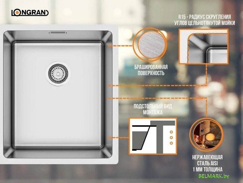 Кухонная мойка Longran TEB340.400 -GT10P (стальной/нержавеющая сталь) - купить в Минске