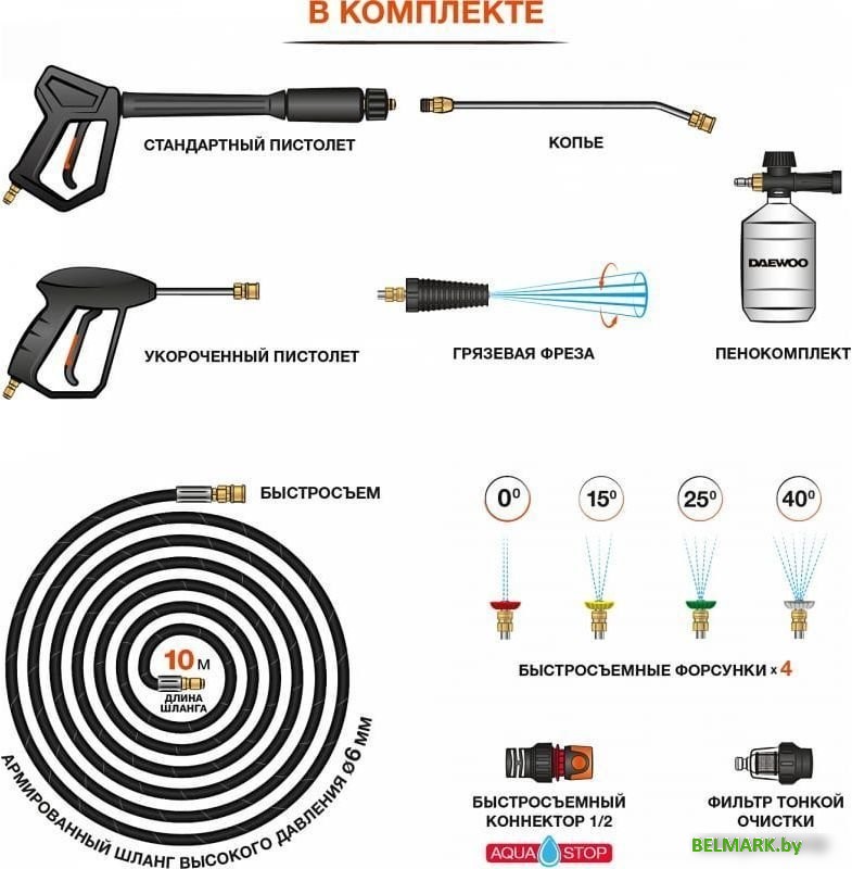 | Насадки | грязевая фреза, пенокомплект, веерная насадка |